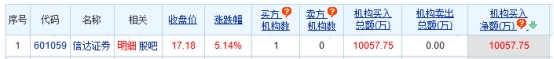 龙虎榜数据显示,买入信达证券金额最大的前五名中,1家为机构专用席位。经统计,机构席位今日买入信达证券净额为10057.75万元。