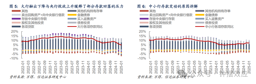 在24年11月存款利率自律机制宣布将非银同业活期存款利率纳入自律管理后,投资者就开始关注银行尤其是大行的同业负债流失可能带来的冲击。24年12月大行非银存款下降了3.4万亿,明显超过了季节性规律。而在1月,一般情况下非银存款都会出现季节性的抬升,但是今年1月大行非银存款又下降了超过1万亿,这直接导致了大行整体存款增速由2024年11月的8.1%下降至4.9%。相较而言,中小行的同业存款增速相对平稳,整体存款增速甚至有所回升。