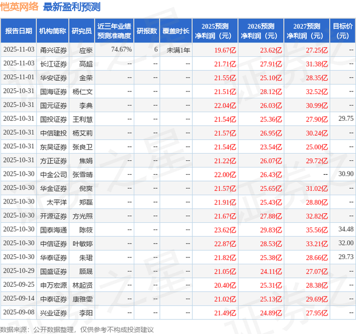 证券之星数据中心根据近三年发布的研报数据计算,甬兴证券应豪研究员团队对该股研究较为深入,近三年预测准确度均值为74.67%,其预测2025年度归属净利润为盈利19.67亿,根据现价换算的预测PE为25.98。