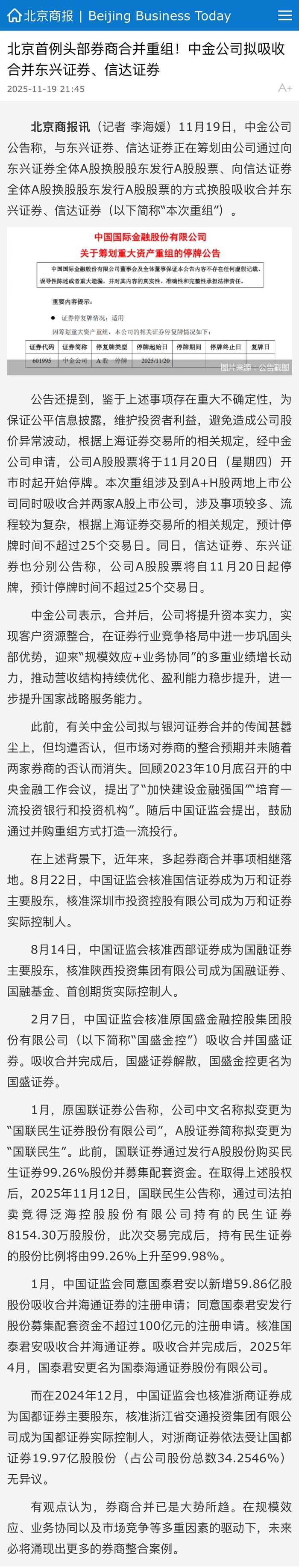 【#北京首例头部券商合并重组#!#中金拟吸收合并东兴证券信达证券# 】11月19日,中金公司公告称,与东兴证券、信达证券正在筹划由公司通过向东兴证券全体A股换股股东发行A股股票、向信达证券全体A股换股股东发行A股股票的方式换股吸收合并东兴证券、信达证券(以下简称“本次重组”)。