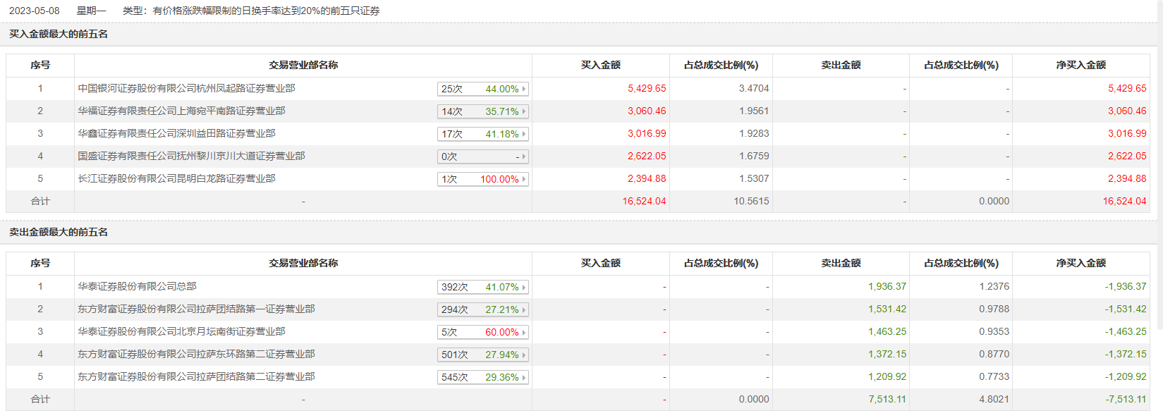 具体来看,中国银河证券杭州凤起路证券营业部、华福证券上海宛平南路证券营业部分别买入5429.65万元、3060.46万元;华泰证券总部、东方财富证券拉萨团结路第一证券营业部分别卖出1936.37万元、1531.42万元。
