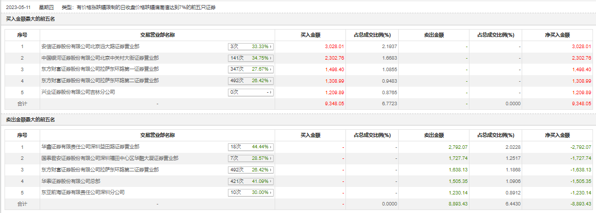 具体来看,华鑫证券深圳益田路证券营业部、国泰君安证券深圳福田中心区华融大厦证券营业部分别卖出2792.07万元、1727.74万元;安信证券北京远大路证券营业部、中国银河证券北京中关村大街证券营业部分别买入3028.01万元、2302.76万元。
