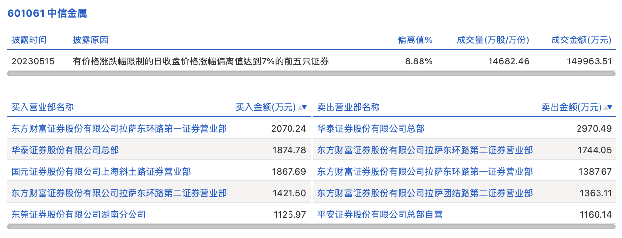 5月15日,中信金属今日涨停,龙虎榜数据显示,上榜营业部席位全天成交1.7亿元,占当日总成交金额比例为11.33%。其中,买入金额为8360.19万元,卖出金额为8625.47万元,合计净卖出265.28万元。