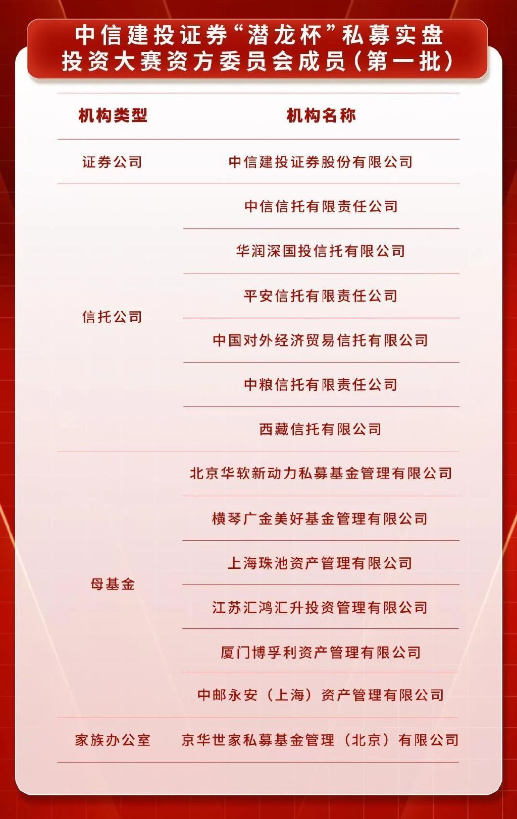 如何打通私募证券管理人资金赋能的“最后一公里”?致力于为市场最有才华的私募管理人高效对接稳定的机构投资者,中信建投证券“潜龙杯”私募实盘投资大赛资方委员会宣告正式成立。会上,来自行业领先信托公司、母基金和家族办公室的代表们,作为资方委员会首批成员集体亮相。