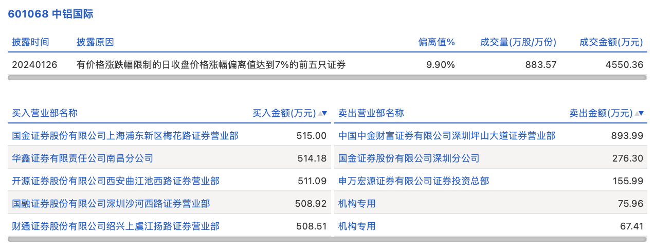 1月26日,中铝国际今日涨停,全天换手率达0.35%,振幅达0%。龙虎榜数据显示,营业部席位合计净买入1088.04万元。其中,机构合计净卖出143.38万元。此外,国金证券上海浦东新区梅花路证券营业部、华鑫证券南昌分公司分别买入515.00万元、514.18万元;中国中金财富证券有限公司深圳坪山大道证券营业部、国金证券深圳分公司分别卖出893.99万元、276.30万元。