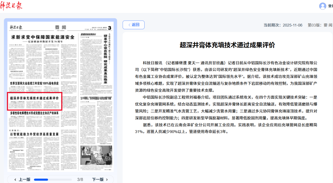 深地开采,技术为先。11月6日,科技日报刊发《超深井膏体充填技术通过成果评价》,对中铝国际长沙院研发的“超深井绿色安全膏体充填新技术”进行了专题报道。该技术成功破解了长期困扰深部采矿的输送、环保与控制难题,从本质上提升了矿山作业的安全性与经济性,展现出公司以自主创新践行“绿色安全高效”开发理念的生动实践。一起来看原文。