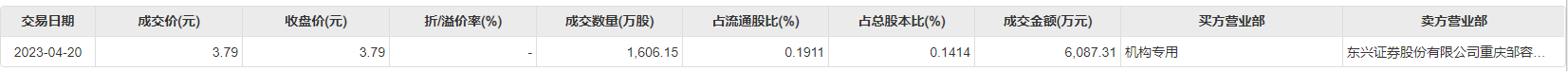4月20日大宗交易成交1606.15万股,成交额6087.31万元,占当日总成交额的19.53%,成交价3.79元,较市场收盘价3.79元持平。