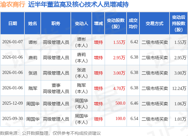 渝农商行近半年内的董监高及核心技术人员增减持详情如下:
