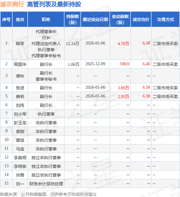 渝农商行的高管列表及最新持股情况如下: