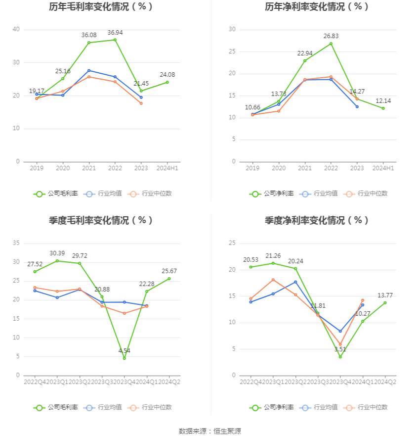 2024年上半年,公司毛利率为24.08%,同比下降5.99个百分点;净利率为12.14%,较上年同期下降8.63个百分点。从单季度指标来看,2024年第二季度公司毛利率为25.67%,同比下降4.05个百分点,环比上升3.39个百分点;净利率为13.77%,较上年同期下降6.47个百分点,较上一季度上升3.50个百分点。