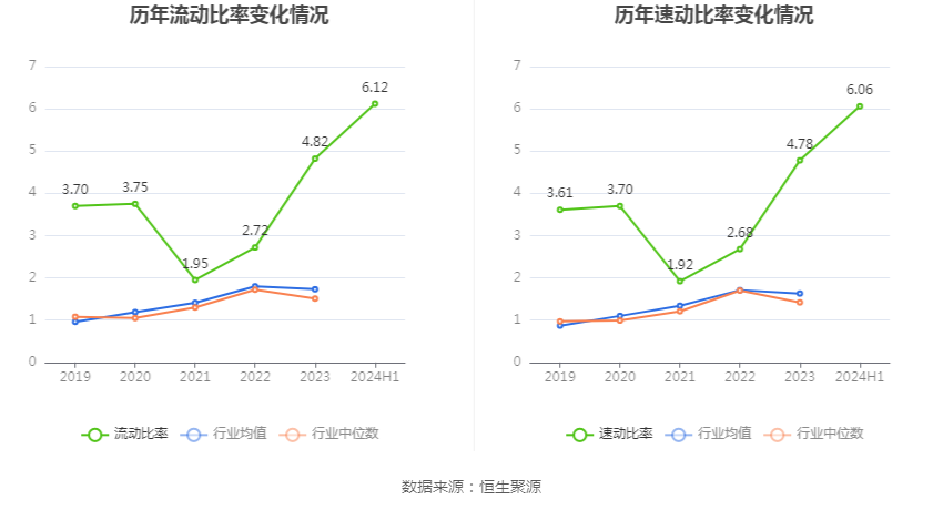 2024年上半年,公司流动比率为6.12,速动比率为6.06。