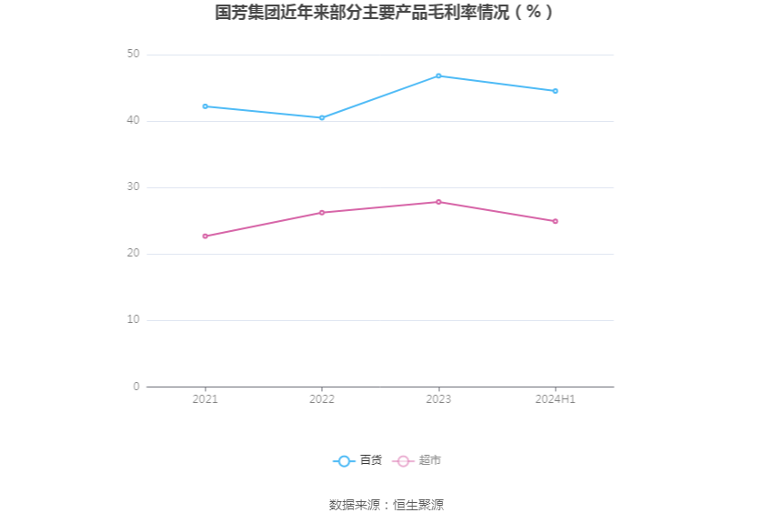 分产品来看,百货、超市、商投2024年毛利率分别为44.52%、24.92%、-47.95%。