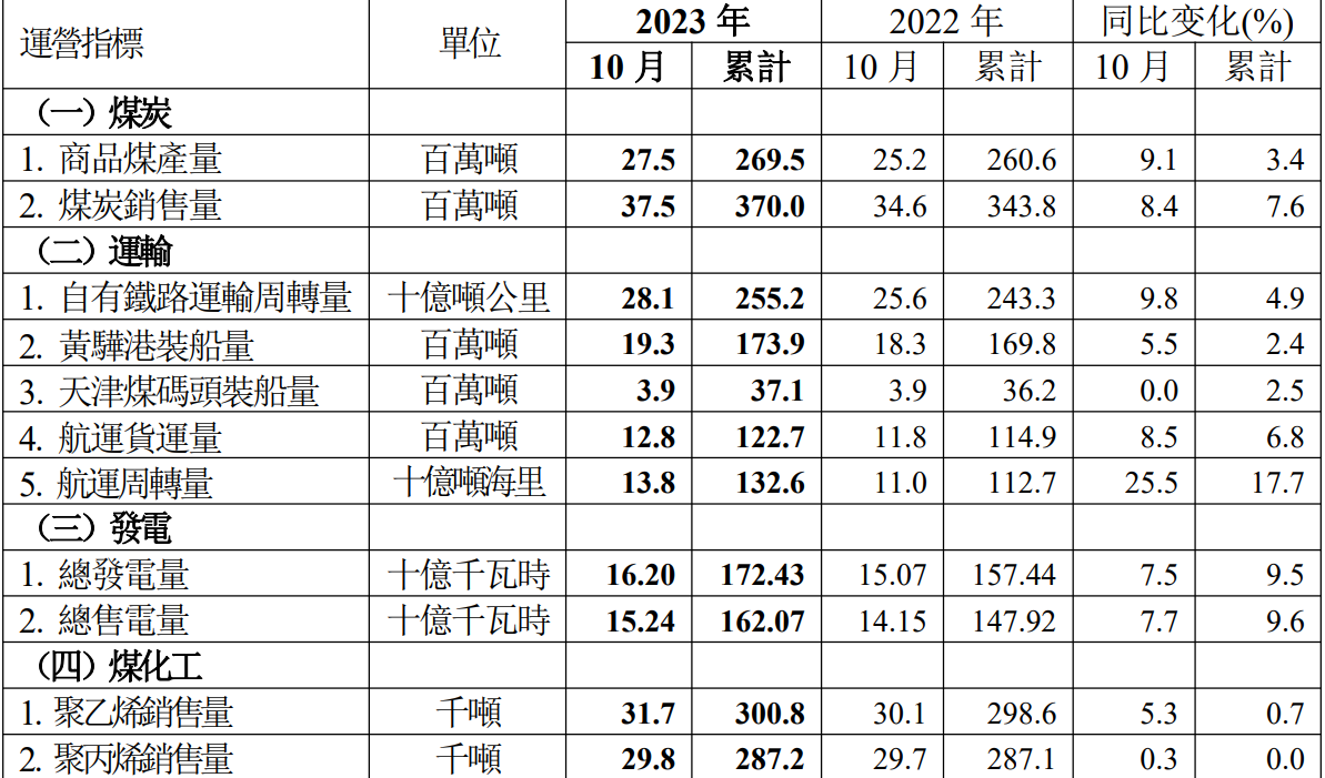 11月13日在港交所发布公告称,10月商品煤产量2750万吨,同比增长9.1%;煤炭销售量3750万吨,同比增长8.4%。前10月煤炭销售量3.7亿吨,同比上涨7.6%。