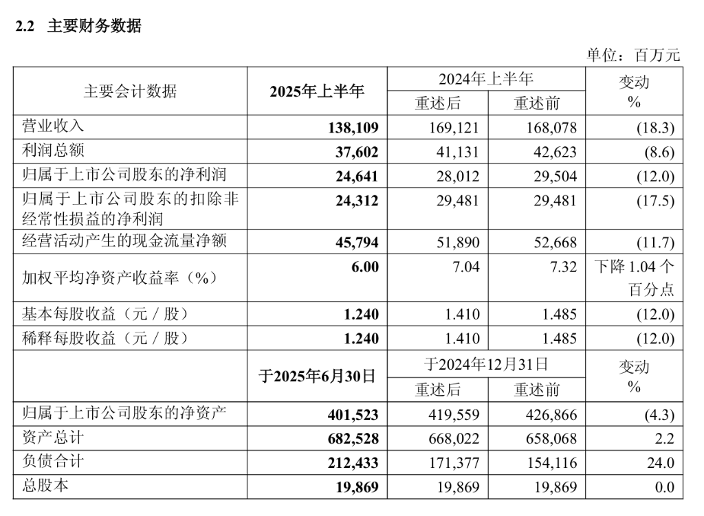 - 基本每股收益从去年同期的1.410元降至1.240元。