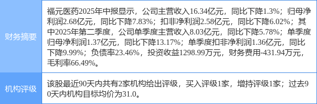 2025年8月26日,太平洋研究员周豫发布了对福元医药的研报《收入端略有下滑,小核酸药物持续推进》,该研报对福元医药给出“买入”评级,认为其目标价为31.0元,研报发布时股价为26.50元,预期涨幅为16.98%。研报中预计2025年-2027年公司营收为36.83/40.26/44.50亿元,同比增长6.89%/9.31%/10.53%;归母净利为5.39/6.19/7.00亿元,同比增长10.33%/14.80%/13.15%,对应PE为24/21/18倍,考虑公司院内集采影响边际加速弱化,院外市场提升空间大,创新药领域持续推进,维持“买入”评级。证券之星数据中心根据近三年发布的研报数据计算,该研报作者对此股的盈利预测准确度为76.99%。