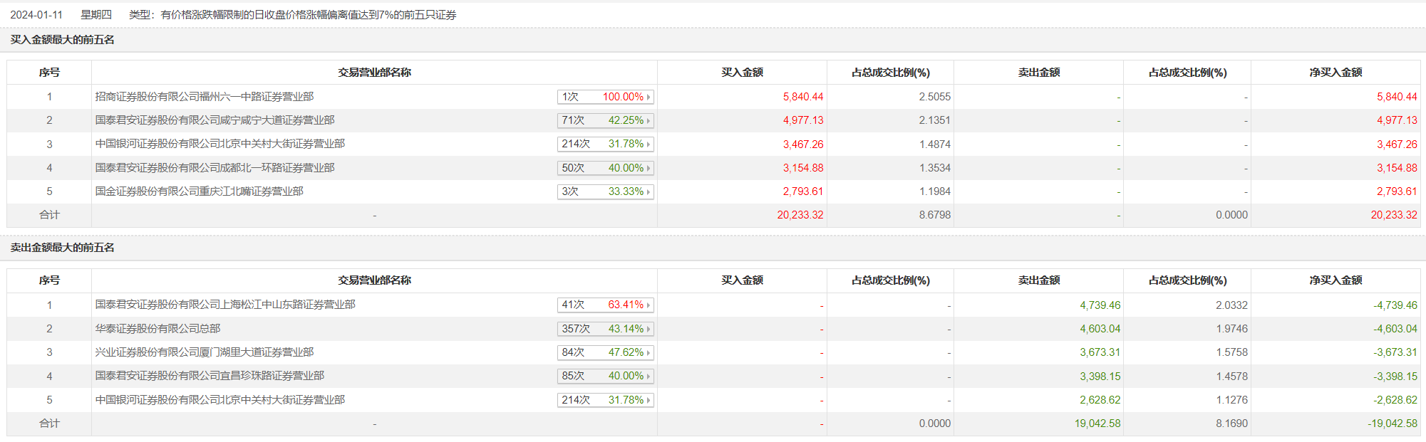 宏盛华源1月11日涨停,全天换手率达56.4%,振幅达12.5%。龙虎榜数据显示,营业部席位合计净买入1190.74万元。其中,招商证券福州六一中路证券营业部、国泰君安证券咸宁咸宁大道证券营业部分别买入5840.44万元、4977.13万元;国泰君安证券上海松江中山东路证券营业部、华泰证券总部分别卖出4739.46万元、4603.04万元。