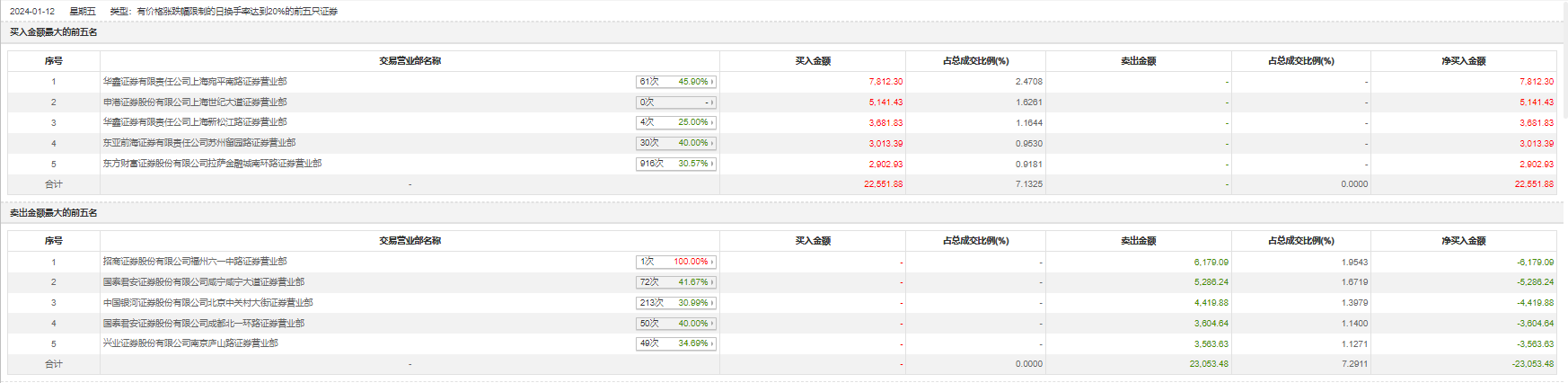 1月12日,宏盛华源今日跌0.44%,龙虎榜数据显示,上榜营业部席位全天成交4.56亿元,占当日总成交金额比例为14.42%。其中,买入金额为2.26亿元,卖出金额为2.31亿元,合计净卖出501.59万元。