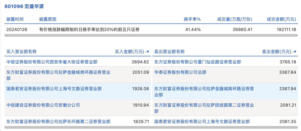 1月26日,宏盛华源今日跌2.56%,龙虎榜数据显示,上榜营业部席位全天成交2.41亿元,占当日总成交金额比例为12.53%。其中,买入金额为1.04亿元,卖出金额为1.37亿元,合计净卖出3249.07万元。