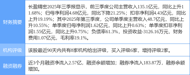 2025年11月9日,太平洋研究员张世杰,罗平发布了对长盈精密的研报《业绩符合预期,新兴业务向好》,该研报对长盈精密给出“买入”评级。研报中预计公司2025-2027年实现营收190.74、218.97、240.43亿元,实现归母净利润6.92、9.58、12.09亿元,对应PE68.51、49.52、39.25x,维持公司“买入”评级。证券之星数据中心根据近三年发布的研报数据计算,该研报作者对此股的盈利预测准确度为79.63%。