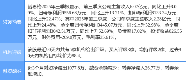 2025年10月31日,太平洋研究员周豫,张崴发布了对诺思格的研报《Q3收入稳健增长,利润增速超预期》,该研报对诺思格给出“买入”评级。研报中预计2025年-2027年公司营收为7.76/8.52/9.69亿元,同比增长4.33%/9.75%/13.79%;归母净利为1.50/1.63/1.81亿元,同比增长6.85%/8.83%/11.26%,对应PE为33/31/28倍,持续给予“买入”评级。证券之星数据中心根据近三年发布的研报数据计算,该研报作者对此股的盈利预测准确度为91.86%。