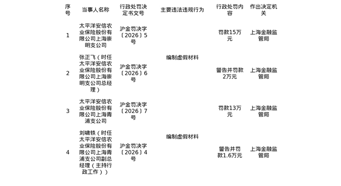 太平洋安信农保上海崇明、青浦两支公司被罚28万,涉编制虚假材料