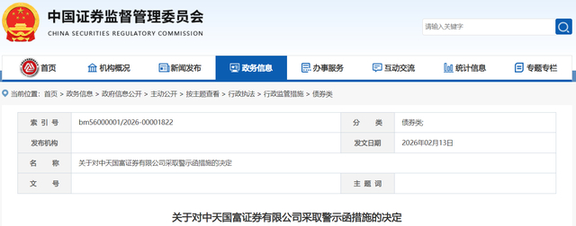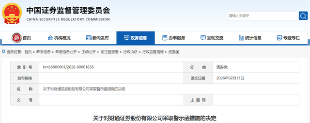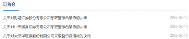 2月13日,证监会连发三张“罚单”,对财通证券、中天国富证券、太平洋证券等3家券商,均采取警示函的行政监管措施。