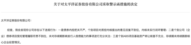 根据《公司债券发行与交易管理办法》(证监会令第113号)第五十八条、《公司债券发行与交易管理办法》(证监会令第180号)第六十八条、《公司债券发行与交易管理办法》(证监会令第222号)第六十九条、《证券公司及基金管理公司子公司资产证券化业务管理规定》(证监会公告〔2014〕49号)第四十六条的规定,证监会决定对太平洋证券采取出具警示函的行政监管措施。