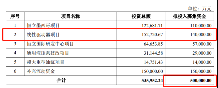 将时间倒回至2021年8月31日。当时恒立液压公告了一项定增预案。计划募资50亿元,主要用于“恒立墨西哥项目”、“线性驱动器项目”等6个项目,其中还包括补充流动资金15亿元,“恒立墨西哥项目”和“线性驱动器项目”则分别投入11亿和14亿元。这里“线性驱动器项目”总投资15.27亿元,根据当时的报告,该项目达产后将形成年产104,000根标准滚珠丝杆电动缸、4,500根重载滚珠丝杆电动缸、750根行星滚柱丝杆电动缸、100,000米标准滚珠丝杆和100,000米重载滚珠丝杆的生产能力,其实这些开始都不是给机器人用的。