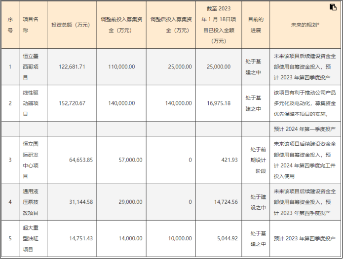 直到2022年12月28日,这次定增进度终于更新。包括高毅资产、国泰君安资管(亚洲)、高盛、阿布达比投资局等在内的8家机构参与认购。虽然认购方都是大名鼎鼎的机构,但是募资总额却从最初预期的不超过50亿元大幅降至20亿元。最终在2023年的1月6日定增完成,距离证监会核准批复的日期只差几天。根据2022年报所披露的募投项目进展情况,原先的6项变成了5项,取消了“补充流动资金”。在剩余5个募投项目中,恒立仅仅保持了“线性驱动器项目”的拟投入资金,没有改变14亿元的投资预算。