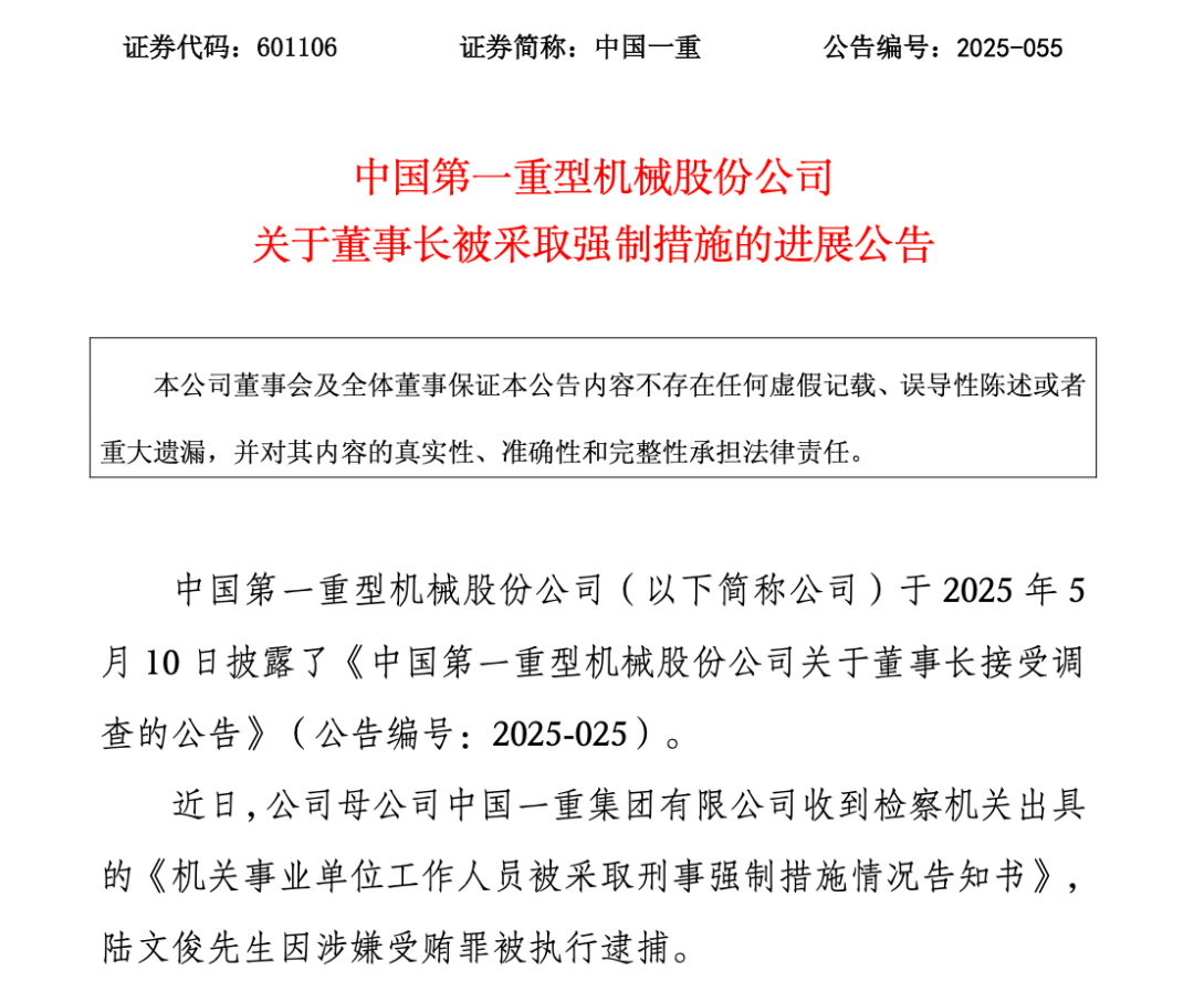 11月18日晚间,中国第一重型机械股份公司(以下简称“中国一重”)发布关于董事长被采取强制措施的进展公告。公告称,近日公司母公司中国一重集团有限公司收到检察机关出具的《机关事业单位工作人员被采取刑事强制措施情况告知书》,陆文俊因涉嫌受贿罪被执行逮捕。