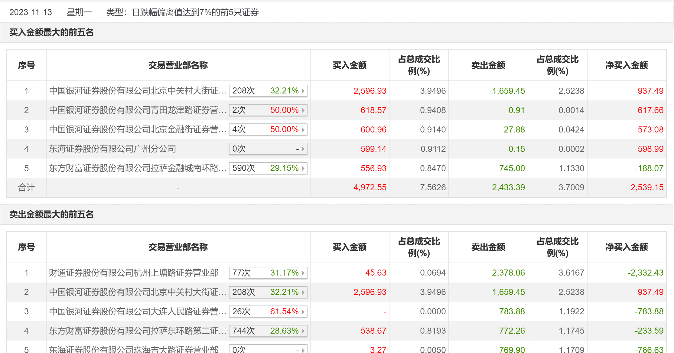 11月13日,锋龙股份今日跌9.83%,全天换手率达23.62%,振幅达6.83%。龙虎榜数据显示,营业部席位合计净卖出1577.38万元。其中,财通证券杭州上塘路证券营业部、中国银河证券北京中关村大街证券营业部分别卖出2378.06万元、1659.45万元;中国银河证券北京中关村大街证券营业部、中国银河证券青田龙津路证券营业部分别买入2596.93万元、618.57万元。