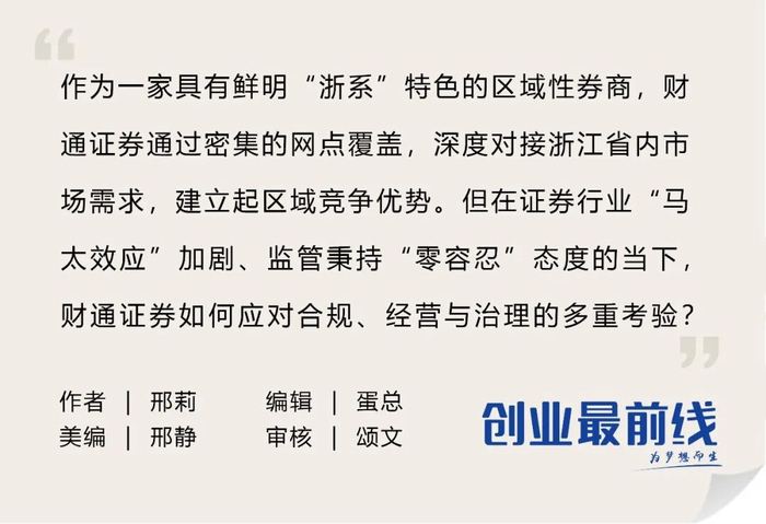 在证券行业“马太效应”加剧、监管秉持“零容忍”态度的当下,财通证券如何应对合规、经营与治理的多重考验,成为这家浙江省属券商的重要课题。