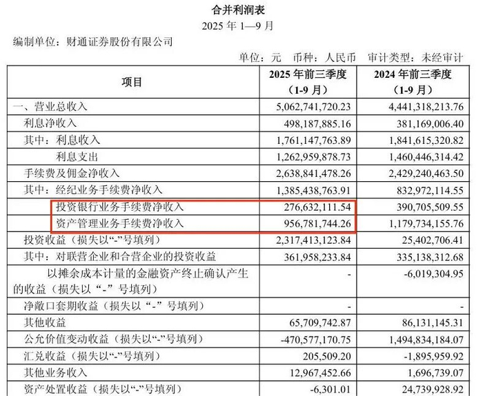 不过,「创业最前线」注意到,其投资银行业务依旧承压。今年前三季度,财通证券投行业务手续费净收入2.77亿元,同比下降29.20%。同时,其资管业务手续费净收入9.57亿元,同比下降18.90%。