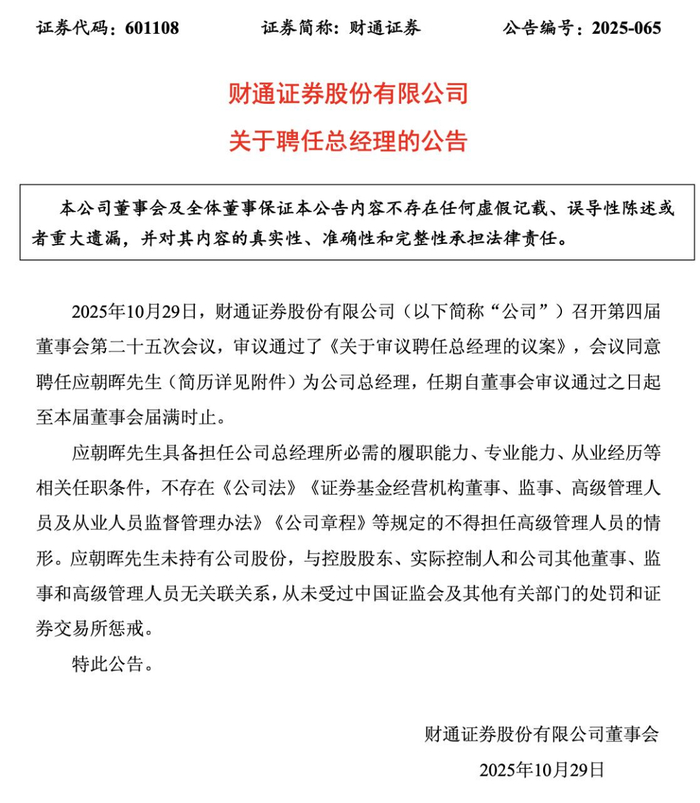 10月29日,财通证券宣布,公司董事会已审议通过《关于审议聘任总经理的议案》,正式聘任应朝晖为公司总经理。