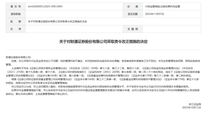 2025年9月,财通证券再次收到浙江证监局开出的警示函,被指出境外子公司风控缺失、提名的境外子公司部分董事任职资格不合规等问题。