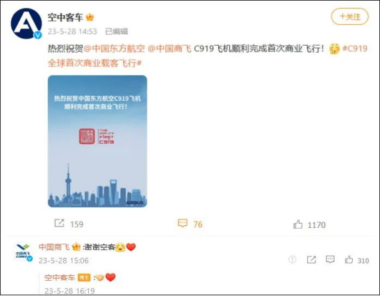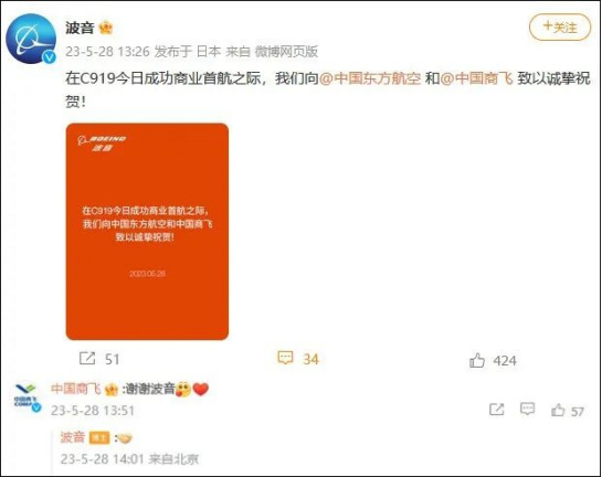 5月28日,@波音@空中客车发文祝贺@中国东方航空和@中国商飞。@中国商飞发布评论表示感谢。