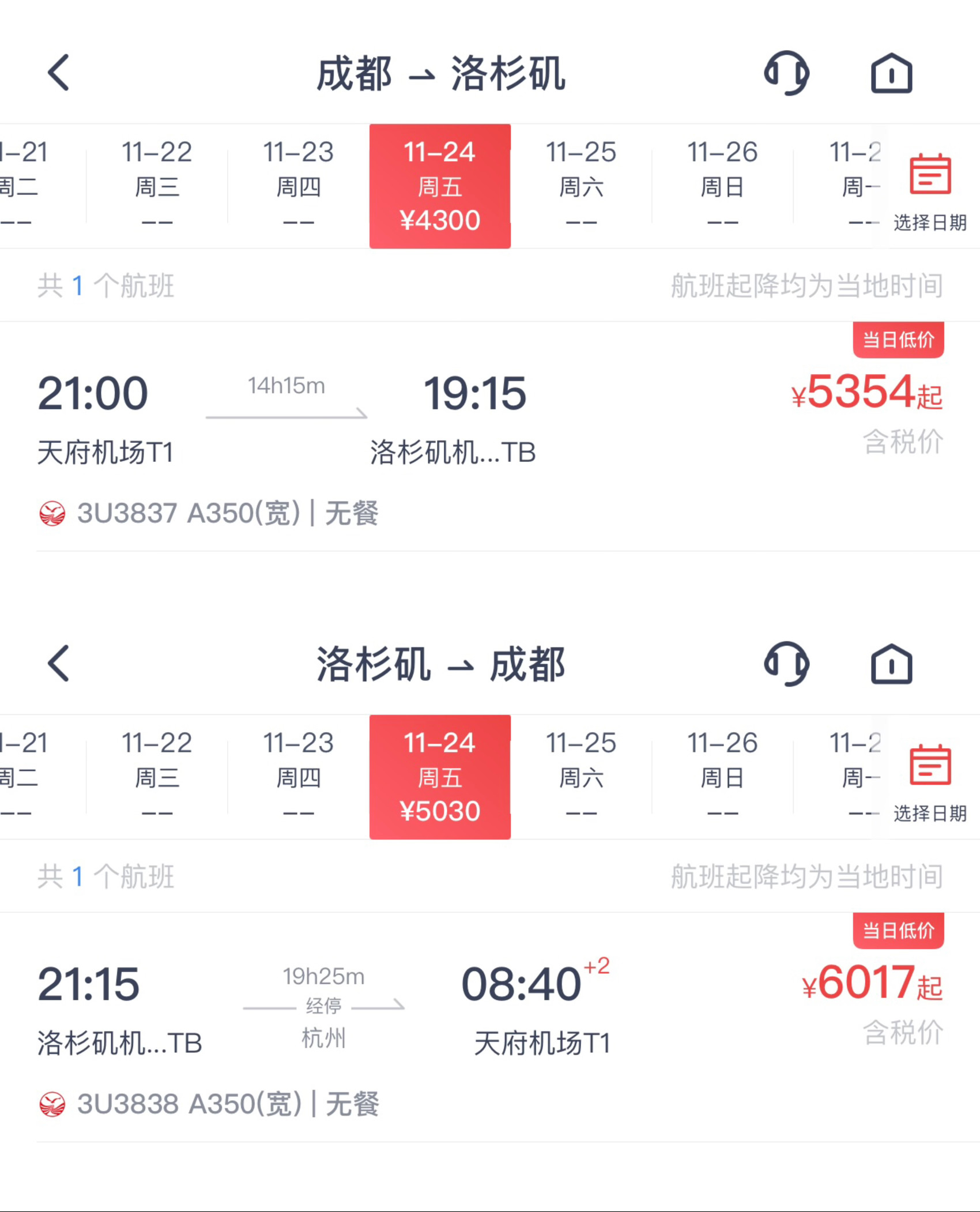 从售票信息来看,成都飞洛杉矶航线由川航采用空客350宽体机执飞,北京时间21时起飞、当地时间19时15分到,单边飞行时长14小时15分;返程经停杭州,当地时间21时15分起飞,北京时间8时40分(+2天)到,单边飞行时间19小时25分钟(国际段)+1小时(国内段)。