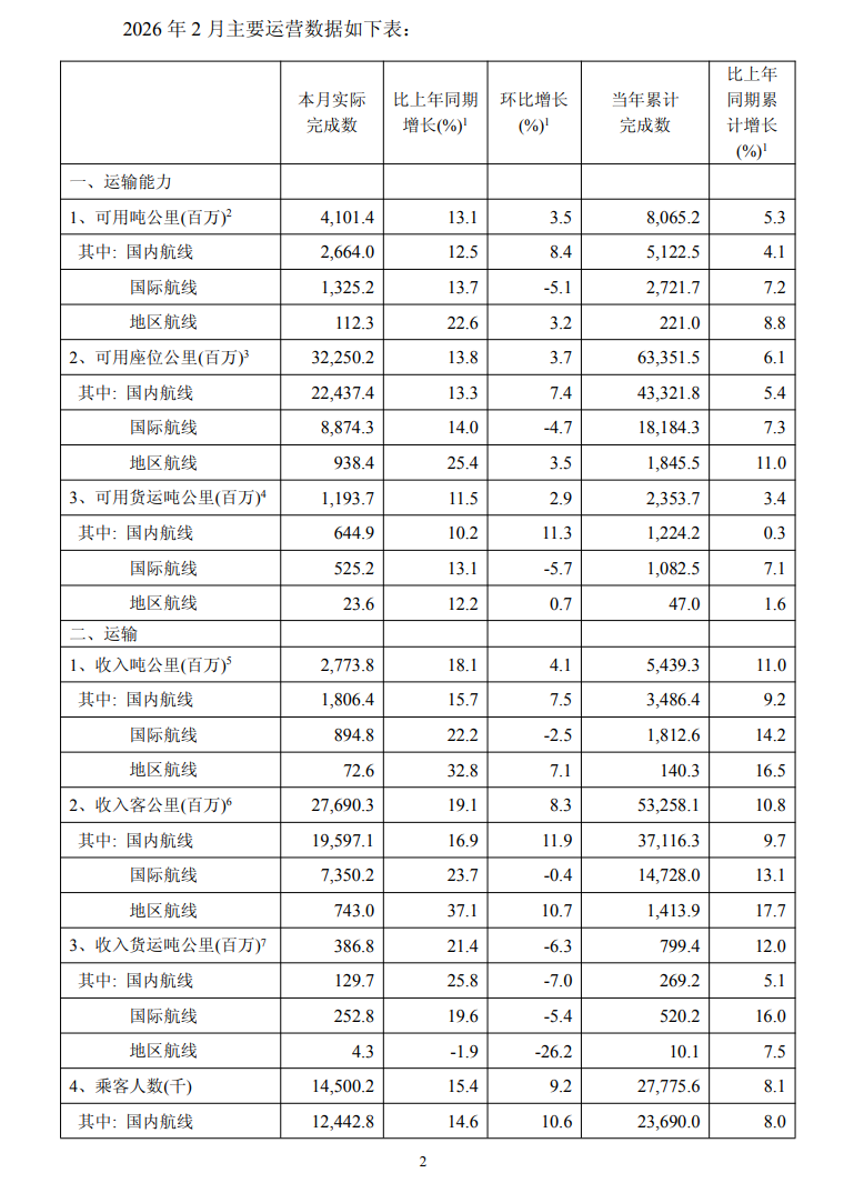 3月16日,中国国航(601111.SH)发布了2026年2月主要运营数据公告。