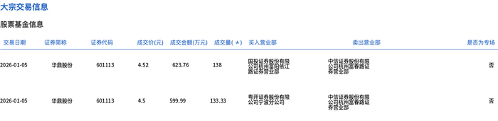 1月5日,华鼎股份大宗交易成交271.33万股,成交额1223.75万元,占当日总成交额的5%,成交均价4.51元,较市场收盘价4.76元折价5.25%,其中最高成交价4.52元,最低成交价4.5元。