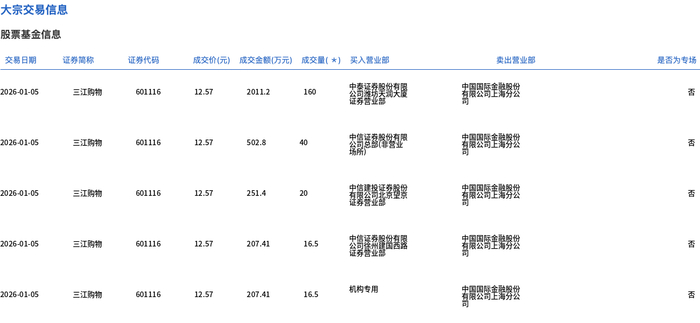 1月5日,三江购物大宗交易成交253万股,成交额3180.22万元,占当日总成交额的13.41%,成交价12.57元,较市场收盘价13.97元折价10.02%。