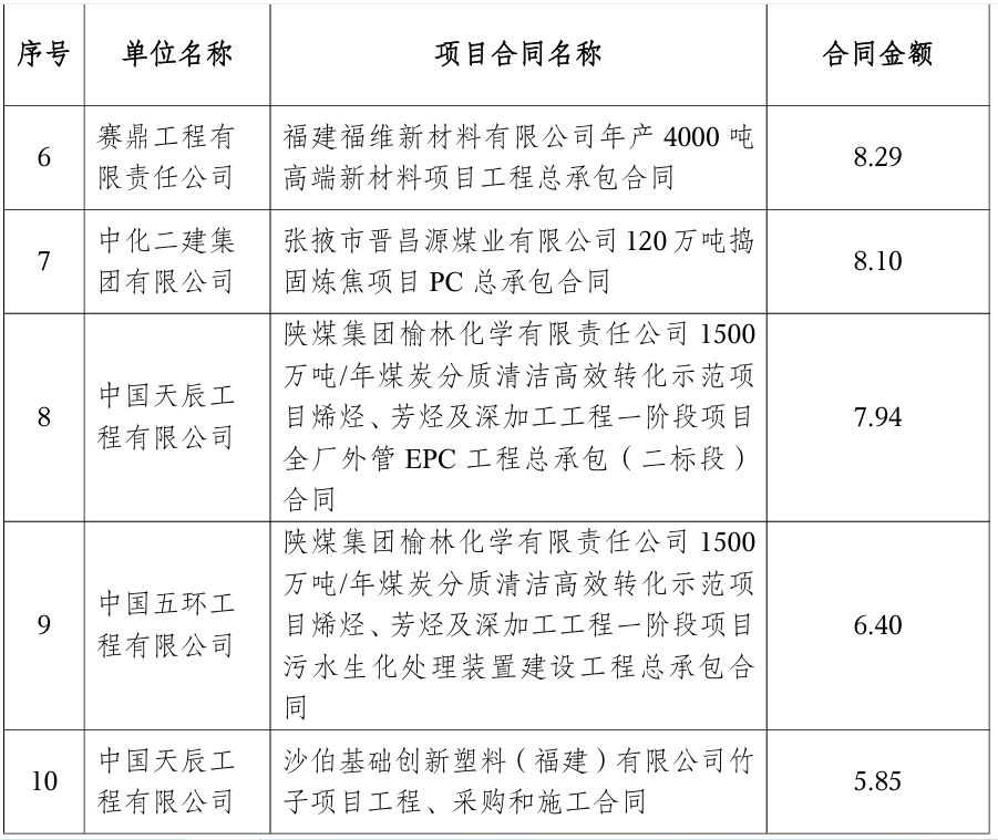 1-11月,中国化学单笔超过5亿元的合同有98个重大项目,在化工新材料这一领域,涉及浙石化、中海壳牌、海辰化学、甘肃巨化、陕煤集团等企业。