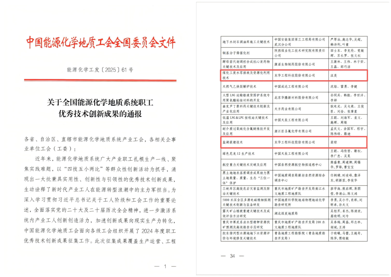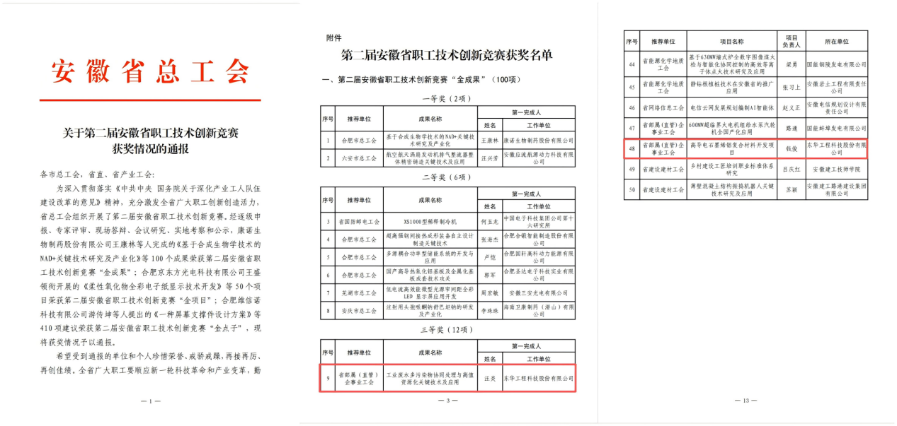 近日,第二届安徽省职工技术创新竞赛与中国能源化学地质工会优秀技术创新成果奖获奖名单相继揭晓,中国化学工程所属东华工程科技股份有限公司《工业废水多污染物协同处理与高值资源化关键技术及应用》斩获安徽省职工技术创新竞赛“金成果”奖,《高导电石墨烯铝复合材料开发项目》获得安徽省职工技术创新竞赛“金项目”奖,两项成果均获安徽省总工会相关经费奖励。《煤化工废水零排放及资源化利用技术》及《盐湖提锂技术》则同时获评中国能源化学地质工会优秀技术创新成果一等奖。