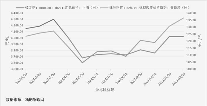2023年,在全球宏观经济整体偏弱运行、下游主要用钢行业较为低迷、以铁矿石为代表的原料端价格等因素影响下,国内钢材市场价格前高后低,整体以宽幅震荡运行。2023年铁矿石价格总体呈现“N”型走势。