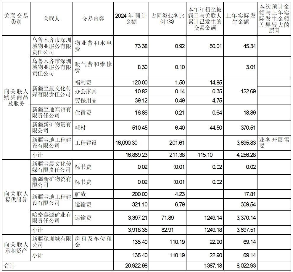 乌鲁木齐市深圳城物业服务有限责任公司、新疆深圳城有限公司、新疆宝地宾馆有限责任公司、新疆宝晨文化传媒有限责任公司、新疆新矿物资有限公司、哈密鑫源矿业有限责任公司、新疆宝地工程建设有限公司:系公司间接控股股东新疆地矿投资(集团)有限责任公司控制或间接控制的除上市公司、控股子公司及控制的其他主体以外的法人,为《上海证券交易所股票上市规则》6.3.3第(二)项规定的关联法人。