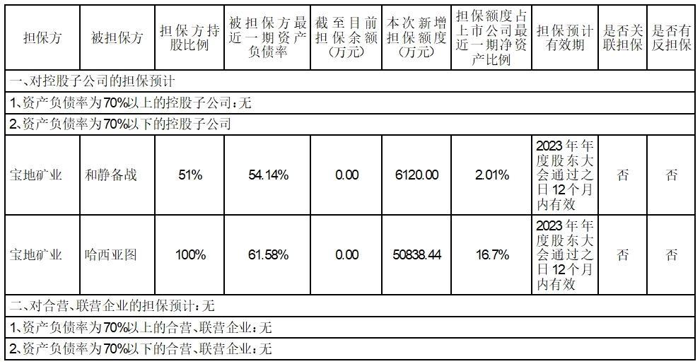 为满足新疆宝地矿业股份有限公司(以下简称“公司”或“宝地矿业”)所属子公司生产经营及投资计划需求,公司拟于2024年度向控股子公司和静备战提供融资担保 6,120.00万元;为全资子公司哈西亚图提供融资担保50,838.44万元。具体的担保方式仅限于信用担保,实际提供担保金额、担保期限以最终签署的担保文件为准。