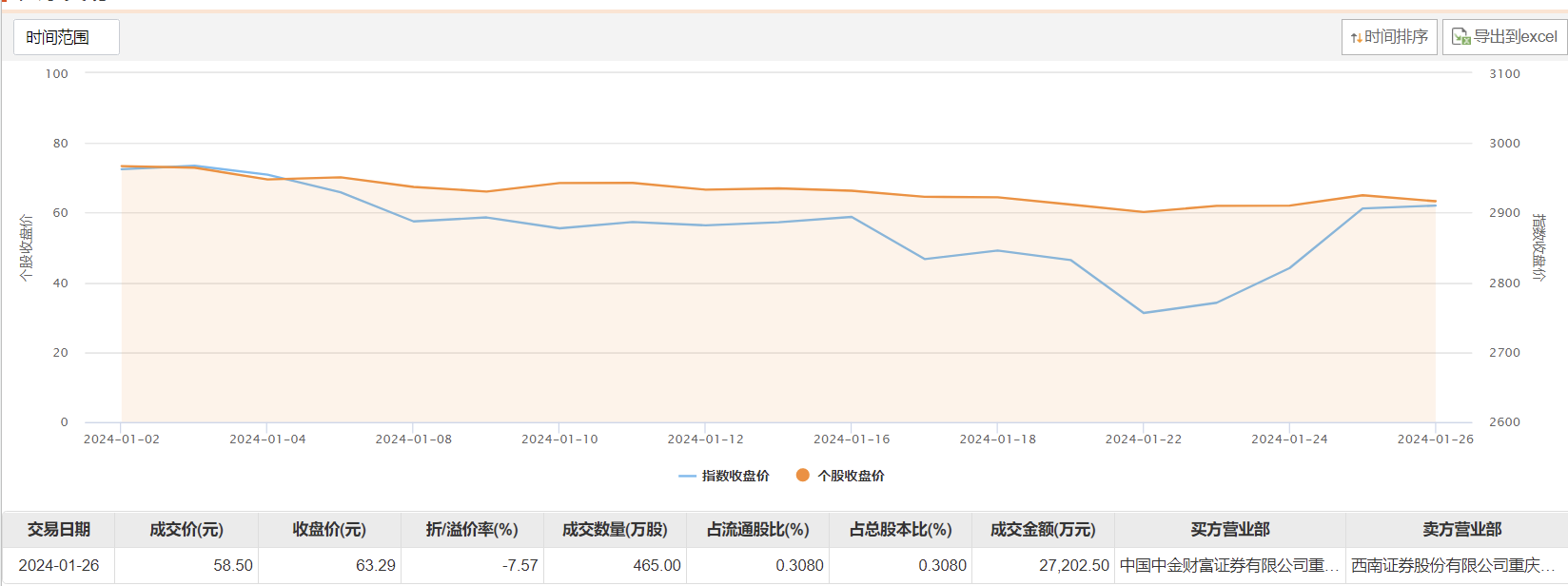 今日大宗交易成交465万股,成交额2.72亿元,占当日总成交额的9.85%,成交价58.5元,较市场收盘价折价7.57%。