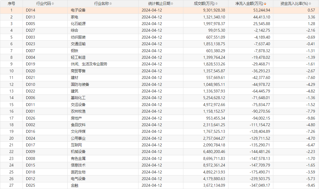 上证报中国证券网讯 Choice数据统计,今日A股主力资金净流出217.18亿元;行业方面,电子设备净流入居首,为5.32亿元,家电净流入4.44亿元,化石能源净流入2.55亿元;净流出金额最多的是金融,为34.7亿元,电气设备净流出23.95亿元,医药生物净流出17.55亿元。个股方面,主力资金净流入前三的是赛力斯、沃尔核材、紫金矿业,分别净流入6.8亿元、3.07亿元、3.06亿元;净流出前三的是中国平安、当升科技、长安汽车,分别净流出7.21亿元、4.53亿元、3.96亿元。
