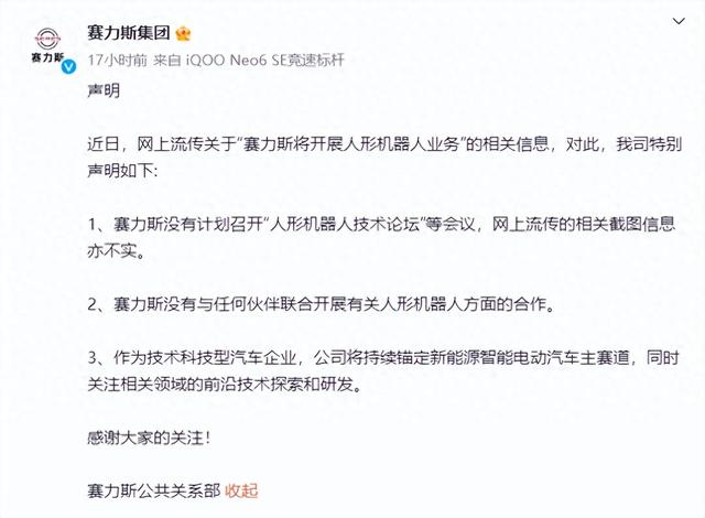 【环球网科技综合报道】近日,针对网络上流传的关于“赛力斯将开展人形机器人业务”的传言,赛力斯集团于11月4日在其官方微博上正式发布声明进行澄清。