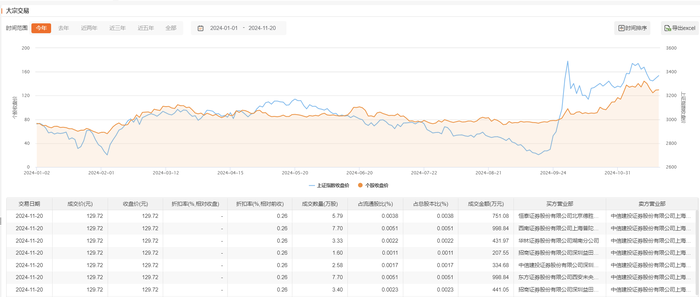今日大宗交易成交32.1万股,成交额4164.01万元,占当日总成交额的0.75%,成交价129.72元,较市场收盘价持平。