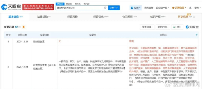 天眼查App显示,近日,赛力斯汽车有限公司发生工商变更,经营范围新增人工智能基础软件开发、人工智能理论与算法软件开发、人工智能应用软件开发等。